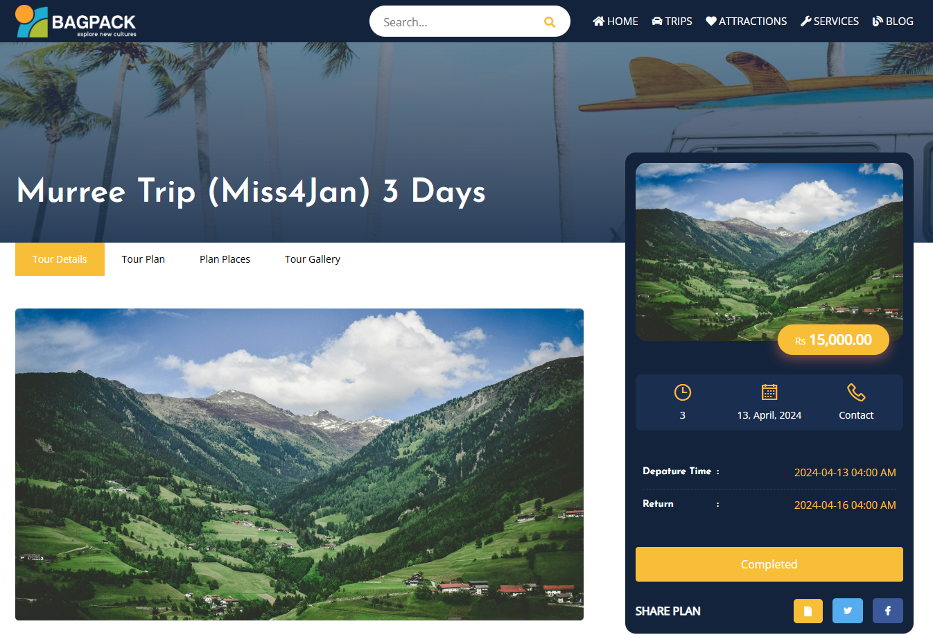 The admin panel allows tour operators to create, update, and manage detailed trip packages. Trips can be organized by title, description, category, and duration. Every trip includes all important data points such as source, destination, activities, and more.